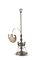 Lucerna in argento con base circolare decorata da foglie e baccellature radiali, vaschetta incisa a foglie lanceolate e quattro beccucci a teste di baccanti, sostegno con presa a lira e ventola sagomata a teste di rapace. Completa di quattro utensili pendenti con catenelle. Recante punzoni di Roma, secolo XIX (h. cm 97) (g lordi 2800) (difetti)