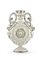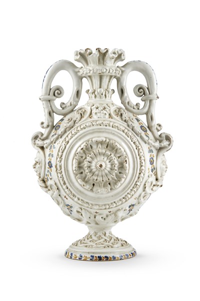 Manifattura di fine secolo XIX - inizio secolo XX. Vaso biansato in maiolica bianca, corpo centrato da rosone a rilievo e collo con bordo orlato, doppia ansa a volute con attacco a mascheroni, corolle floreali in policromia ai lati (cm 25x35) (sbeccature)