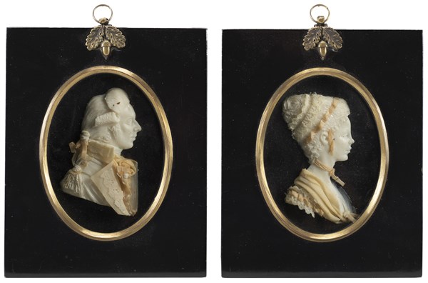 Scultore della fine del secolo XVIII. Profili di gentiluomo e gentildonna, coppia di rilievi in cera (cm 8,5x5) In cornici ebanizzate con porta anelli in metallo a ghianda e foglie (lievi difetti)