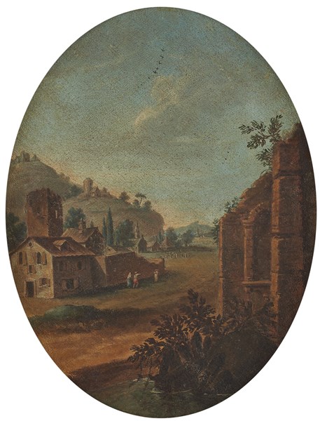 Scuola veneta del secolo XVIII Paesaggio con villaggio e figure e Paesaggio f