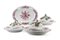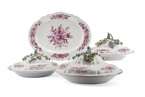 Manifattura Ginori, Doccia, secolo XIX. Tre legumiere di forma mossa con coperchio e un vassoio ovale in porcellana decorata in porpora e oro a mazzetti floreali, prese a rami fioriti (d. max cm 30) (difetti e restauri)