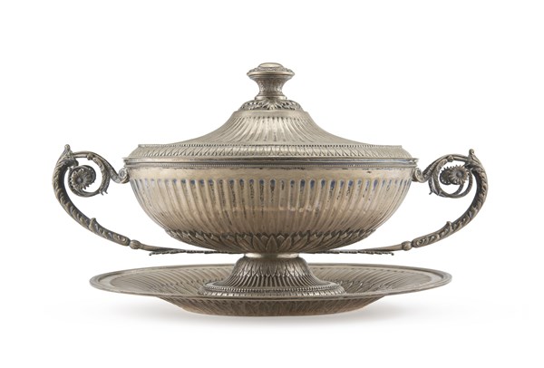 Lot 547 | Zuppiera con coperchio e présentoir in argento a coppa baccellata e biansata a