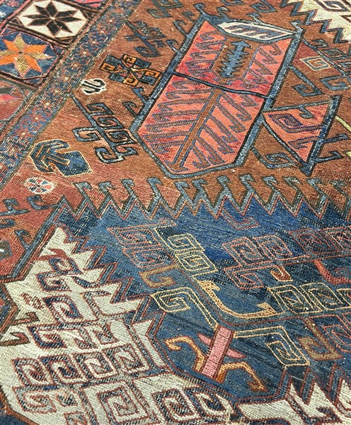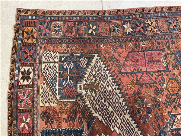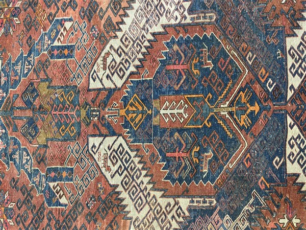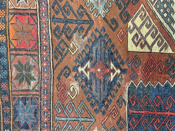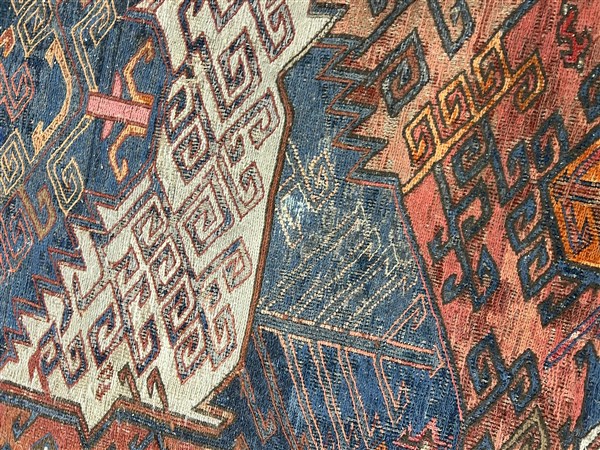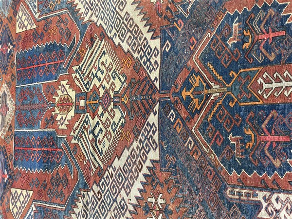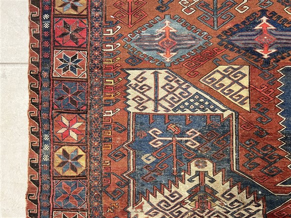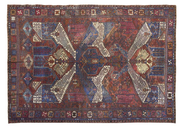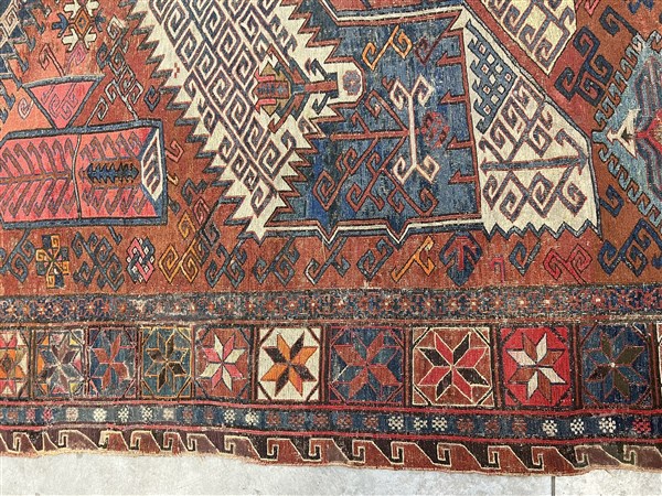 Tappeto Soumak a draghi, Caucaso, fine secolo XIX. Decoro "a draghi" derivante dai tre motivi principali che si ispirano ai tappeti draghi armeni dei secoli precedenti (cm 337x245) (difetti e restauri)