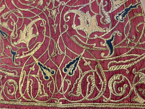 Arazzo dell'Impero Ottomano, secolo XVIII. Ricamato su fondo di raso di seta color rosso cardinale. Decoro ispirato ai motivi persiani di epoca Safavide in fili di rame dorato imbottiti a formare volute e rami fioriti con numerosi gigli di differenti dimensioni e colori: dall'azzurro al rosa, blu e verde. Al centro due piccoli medaglioni a forma di lancia con puntale (cm 160x110) (difetti e déchirure)
