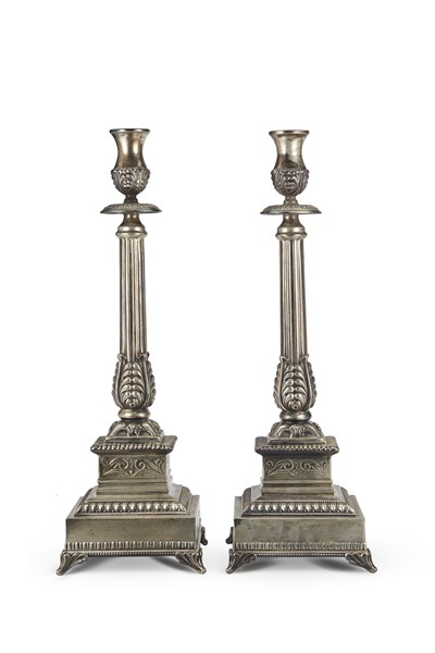 Coppia di candelieri in argento a colonna scanalata decorata a palmette e fogli