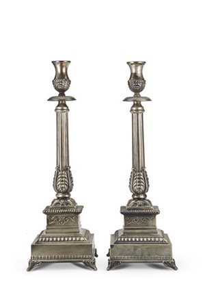 Coppia di candelieri in argento a colonna scanalata decorata a palmette e foglie, base squadrata su piedi a rocailles. Austria, fine secolo XIX - inizio secolo XX (h. cm 42) (g 1250) (lievi difetti)