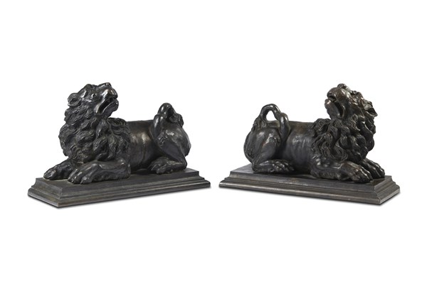 Lot 559 | Antica coppia di leoni in bronzo poggianti su base rettangolare modanata (L. cm