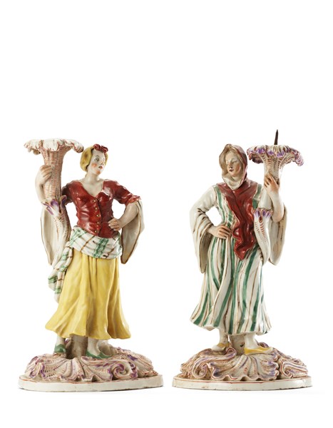 en. Different manufactures. Two antique porcelain candlesticks painted in polychrome with body in the shape of female figures, one of which bearing mark (h. cm 20) (defects)