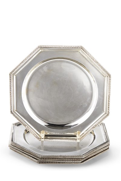 Sei piatti in argento ottagonale con bordo godronato. Milano, Argentiere I. Pra