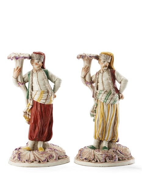 Coppia di antichi candelieri in porcellana dipinta in policromia con corpo in foggia di figure orientali con copricapo reggicornucopia, recanti marchio con ancora in rosso (h. cm 23) (difetti)
