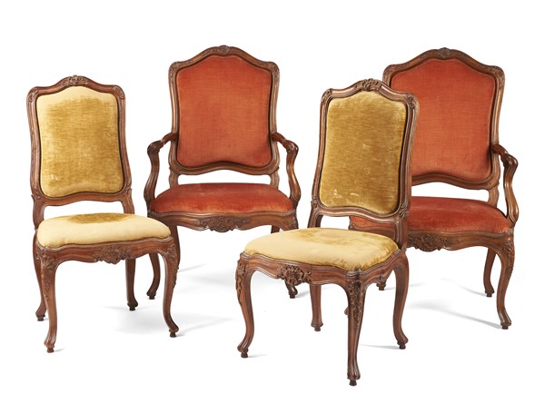 Gruppo di due poltrone e due sedie in noce intagliato, fascia centrata da fiori e foglie. Genova, secolo XVIII (difetti)