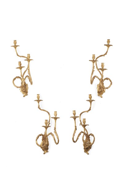 Gruppo di quattro applique a tre fiamme in legno intagliato e dorato, bracci sagomati e decorati a volute fogliate. Secolo XIX (h. cm 90) (difetti e mancanze)