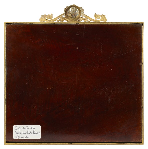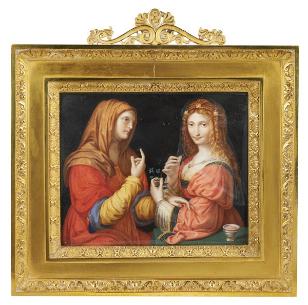 Marietta Bassi. Modestia e Vanità, da Bernardino Luini, placca in avorio dipinto (cm 10,5x12,5) Firmata M. Bassi e datata 1839 in basso a destra. Entro cornice coeva in bronzo dorato. In teca