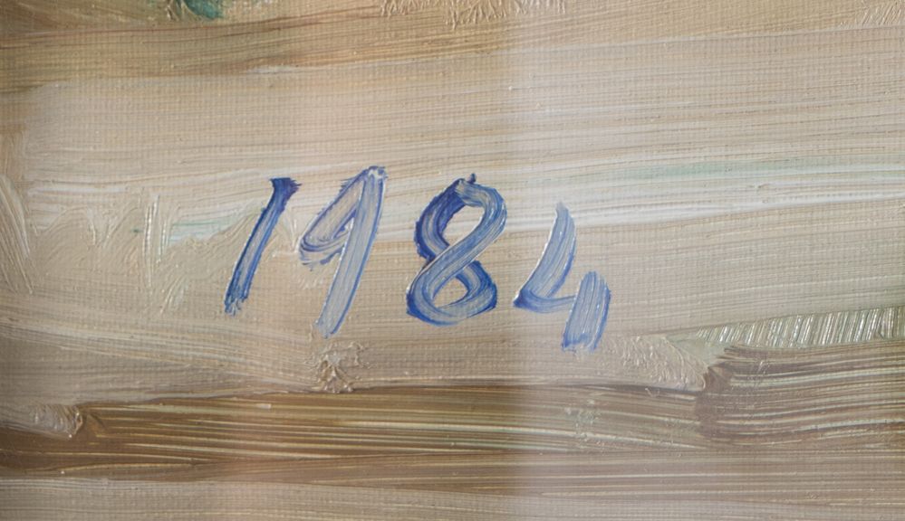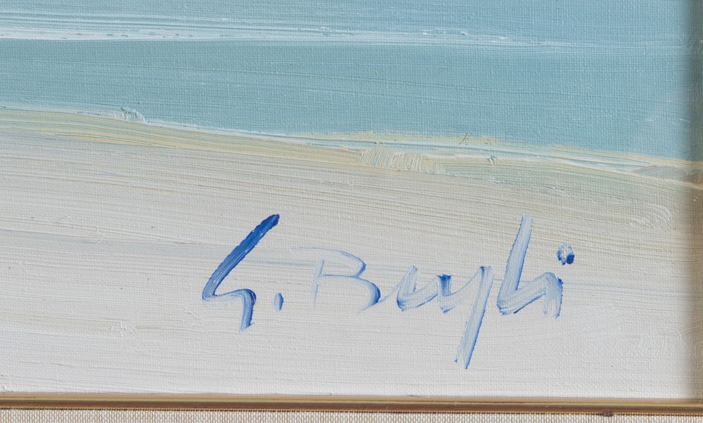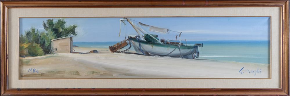 GUIDO BUGLI (Bologna 1912 - 2003) "Spiaggia", 1984. Olio su tela. Cm 30x120. Opera firmata in basso a destra G. Bugli. Opera datata in basso a sinistra 1984.