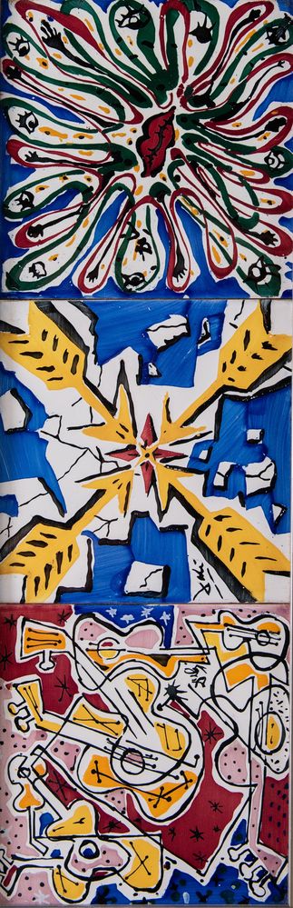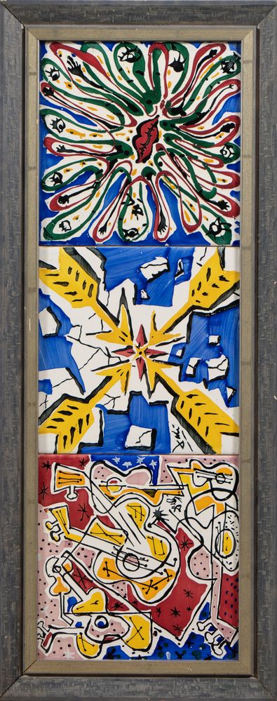SALVADOR DALÌ (Figueres 1904 - 1989) "Senza titolo", 1954. Lotto composto da tre piastrelle in ceramica policroma smaltata. Cadauna di cm 20x20. Cm totali: 20x60.