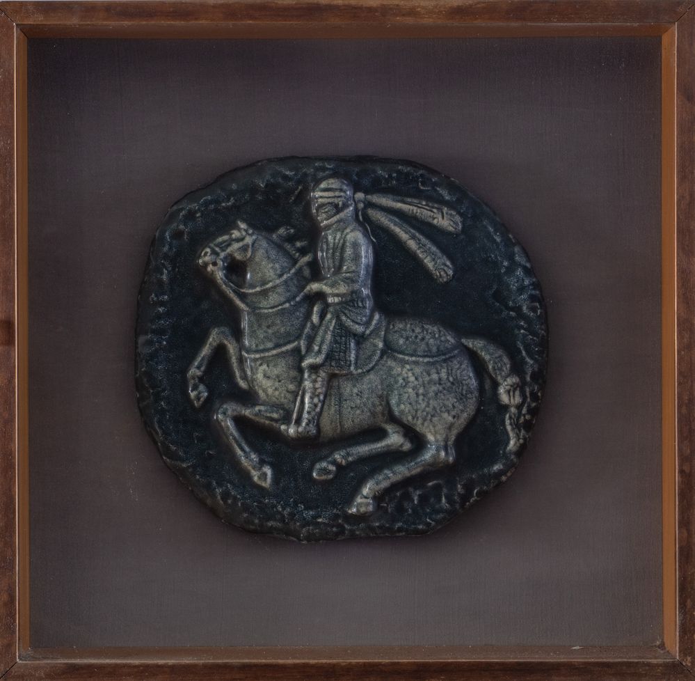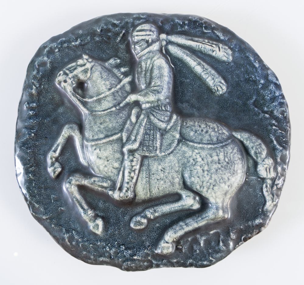 QUINTO GHERMANDI (Crevalcore 1916 – San Lazzaro di Savena 1994) "Cavaliere". Bassorilievo in ceramica policroma. Cm Ø 39.