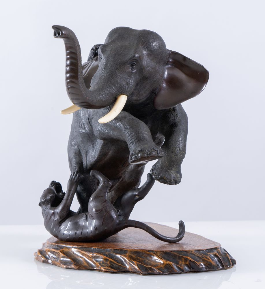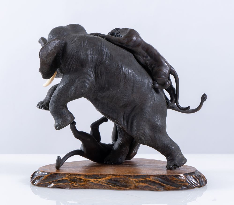 GENRYUSAI SEIYA (epoca Meiji (1868-1912), fine XIX/inizio XX secolo) "Elefante attaccato da due tigri". Okimono in bronzo. Cm 27,3x33,4x20,7.Opera firmata sul ventre dell'elefante in caratteri tensho Genryusai Seiya Tsukuru all'interno di un sigillo quadrato.