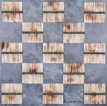 BERNARD AUBERTIN Fontenay aux Roses 1934 Dessin de feu, 2008 fiammiferi bruciati su alluminio cm. 50x50, firma e anno in basso a destra, dichiarazione d'autenticità dell'artista su foto, pubblicata sul catalogo della mostra "Bernard Aubertin, Fuoco e metallo", tenutasi presso la Galleria Allegrini Arte, pagina 62, entro teca in plexiglass.