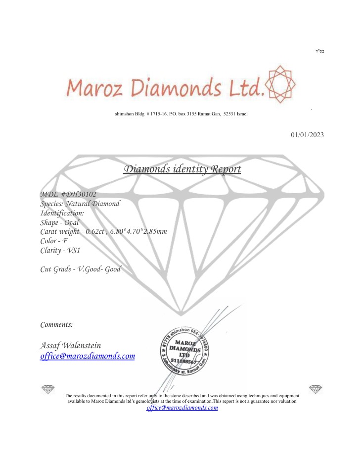 DIAMANTE 0,62 CT F - VS2 - TAGLIO OVALE - CERTIFICATO ID - DH30102