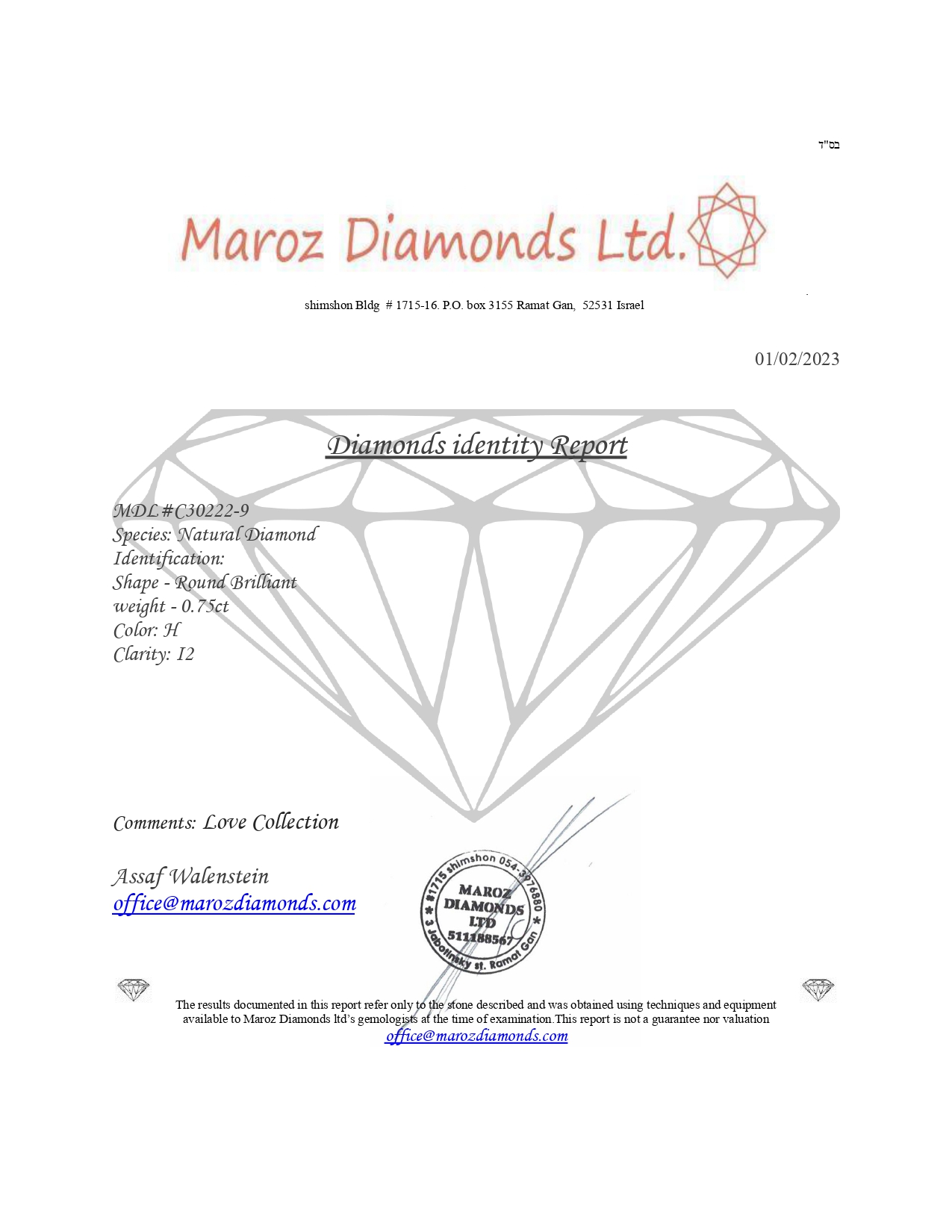 DIAMANTE 0,75 CT H - I2 - TAGLIO BRILLANTE - INCISO AL LASER + CERTIFICATO ID *LOVE COLLECTION* - C30222-9
