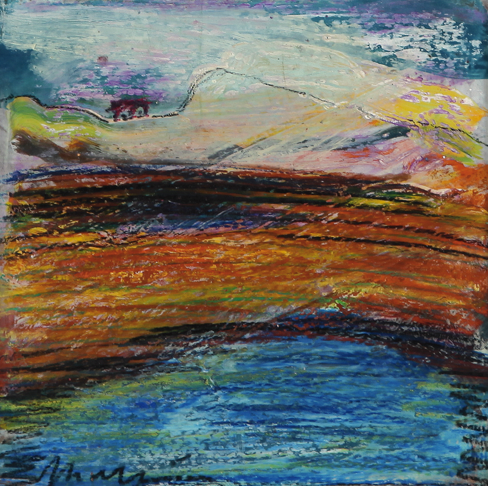 PIERO MAGGIONI Monticello Brianza (Co) 1931 - Vigano' (Co) 1995 Paesaggio olio su masonite cm. 22x22, firma in basso a sinistra.