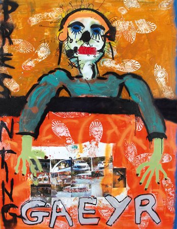 PAUL KOSTABI Whittier (California) 1962 Get up and go, 2005 acrilico, marker e collage con impronte su tela cm. 178x134, firma, titolo e anno al retro, dichiarazione d'autenticità dell'artista e timbro della Galleria Pancaldi (Roma) su foto, opera senza cornice.