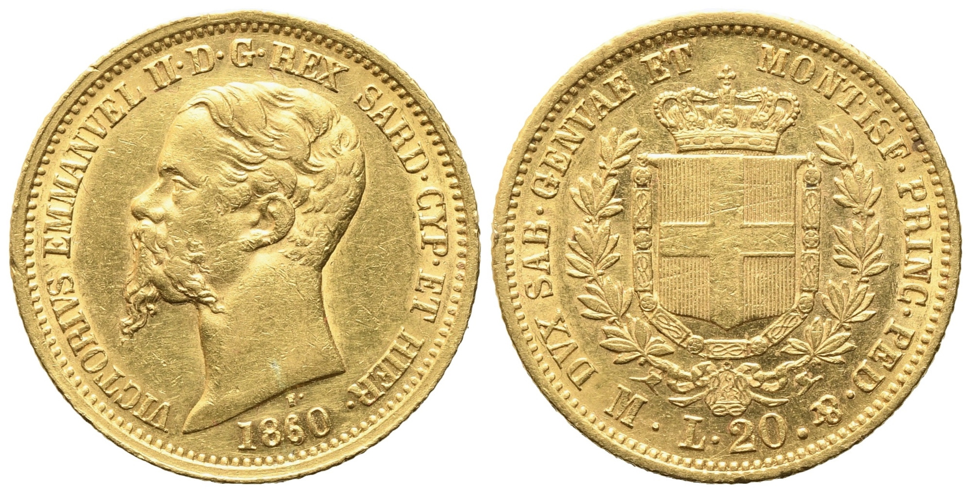 Torino. Regno di Sardegna. Vittorio Emanuele II, 20 lire 1860 Milano. Au (6,41 g). NC. Gig.20 qSPL