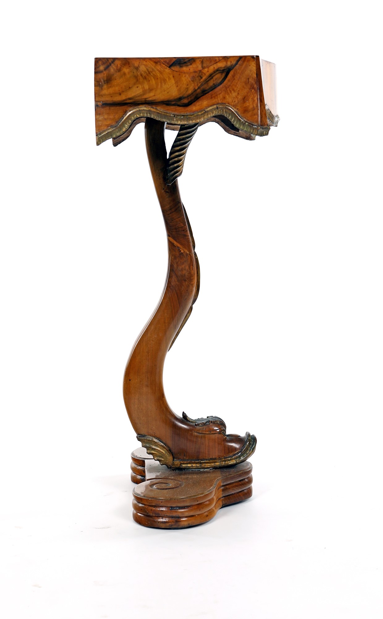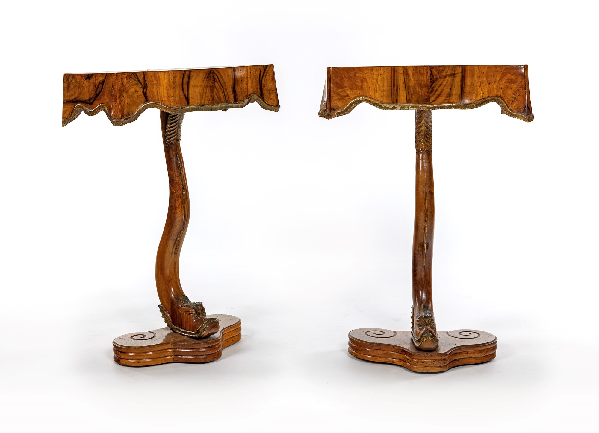 Coppia di piccole console in radica, XX secolo caratterizzate da fascia sagomata con profilo intagliato e dorato a simulare un drappo teso sul piano; sostegno centrale a guisa di delfino su base trilobata, cm 75x46,5x29 (lievi differenze di misura)