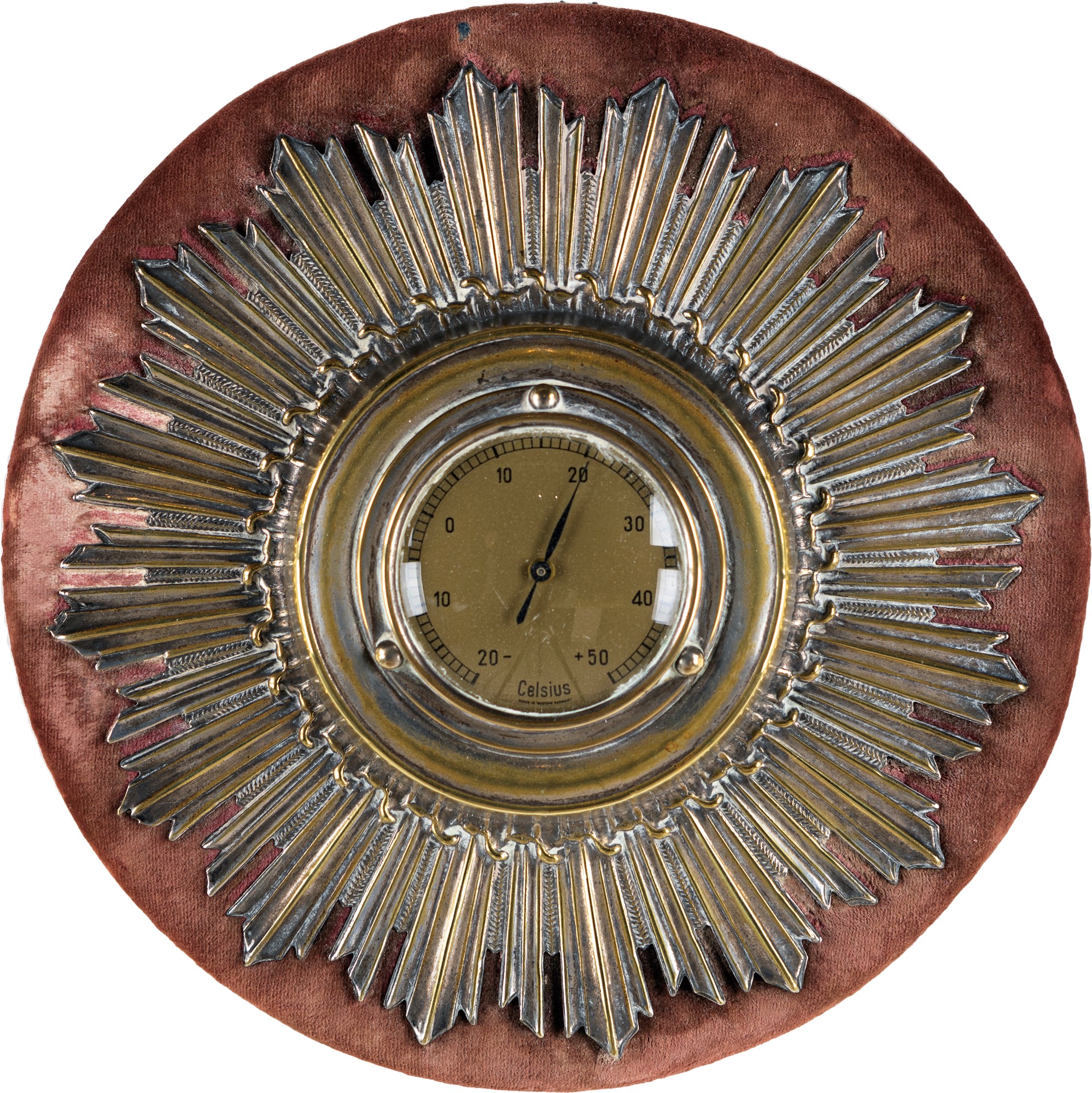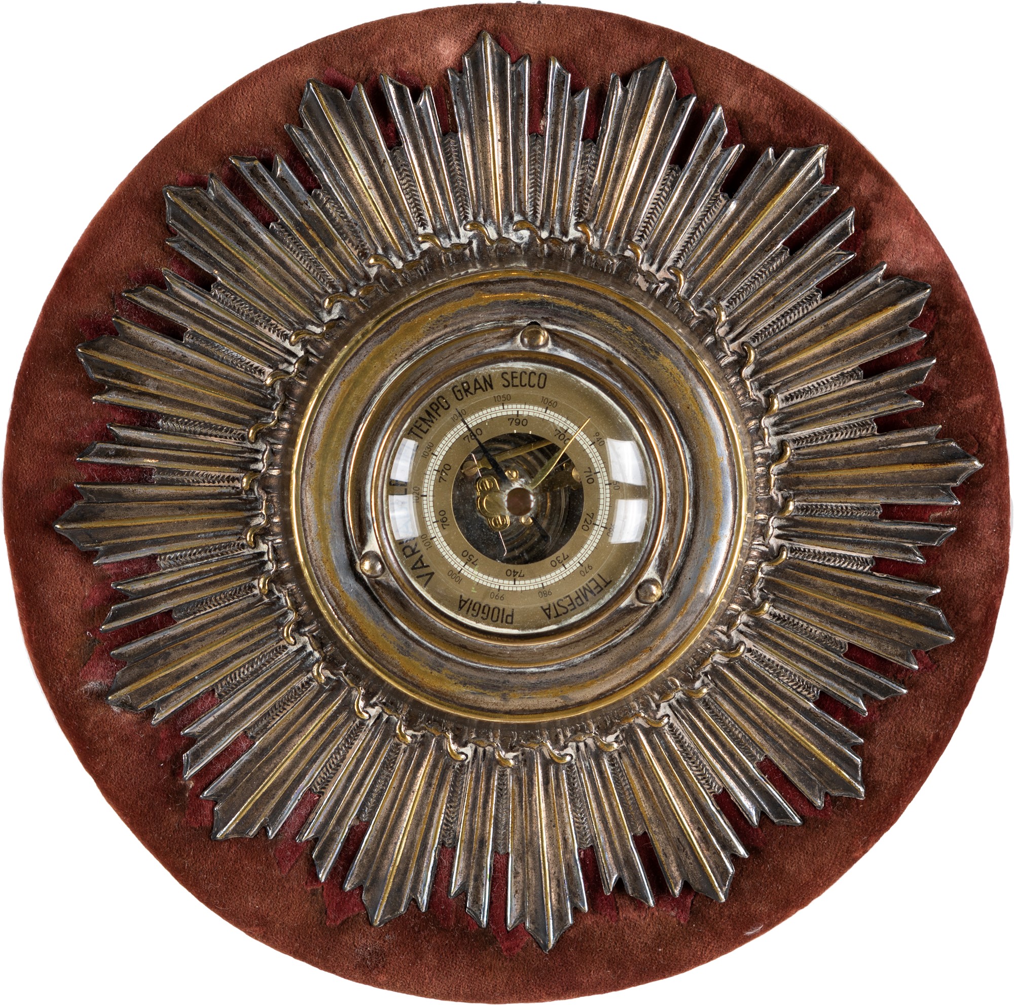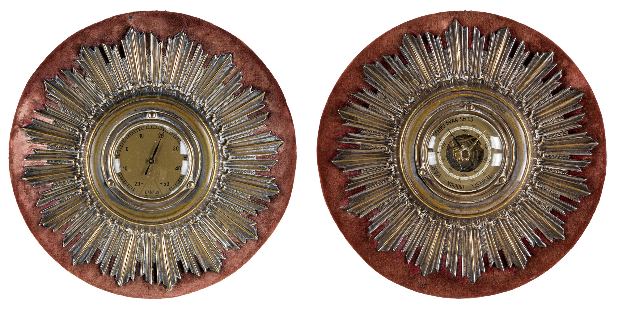 Termometro e barometro da parete in metallo cromato, Germania, metà del XX secolo con quadrante circolare entro ampia cornice a raggiera; il termometro con gradi Celsius indicati a numeri arabi, iscritto made in Western Germany; il barometro con indicazioni climatiche in italiano è Made in Germany, diametro cm 21,5