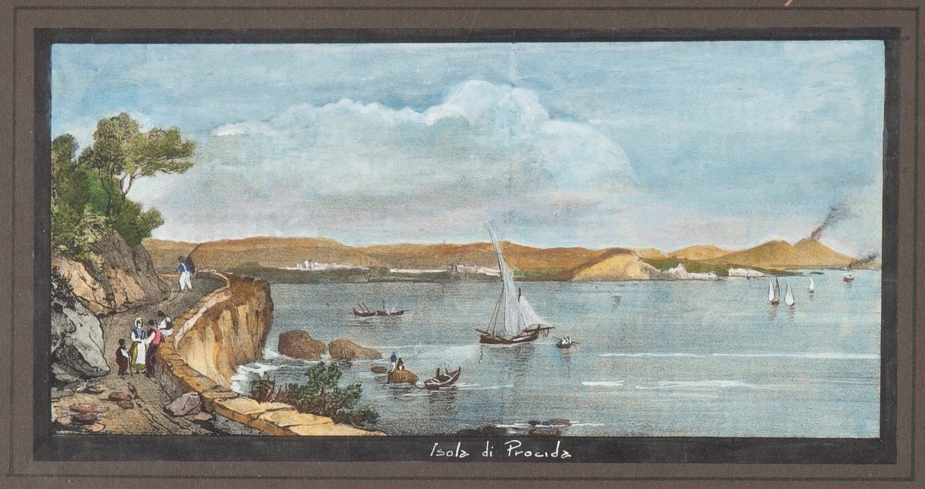 Pittore del XX secolo, delineato acquerellato , Isola di Procida applicato su...