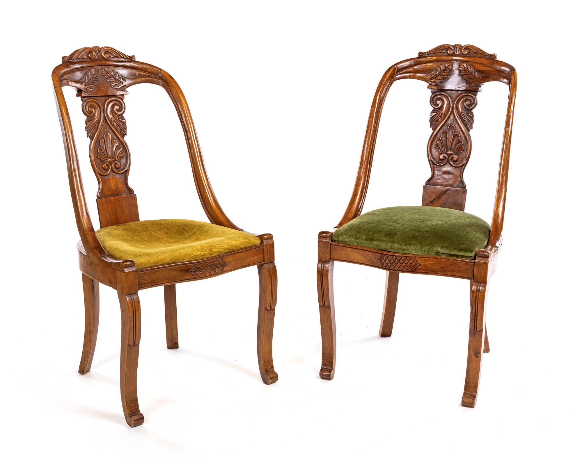 Coppia di sedie a gondola, XIX secolo con schienale a giorno decorato da rilievi vegetali intagliati, sedile imbottito, gambe anteriori sagomate, posteriori a sciabola, cm 89x46x44