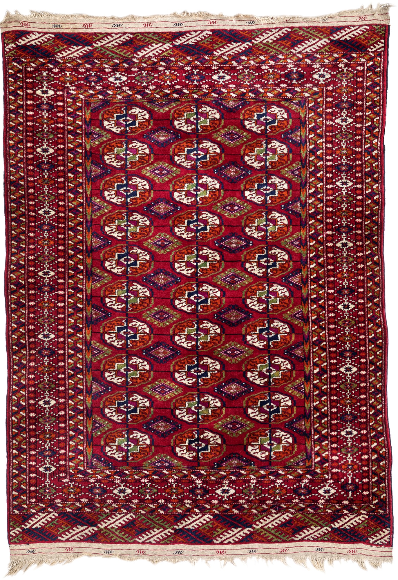 Tappeto Turkmenistan annodato a mano, disegno Bukhara fondo rosso a tre file parallele con dieci medaglioni alternate a losanghe entro molteplici bordure, cm 143x107