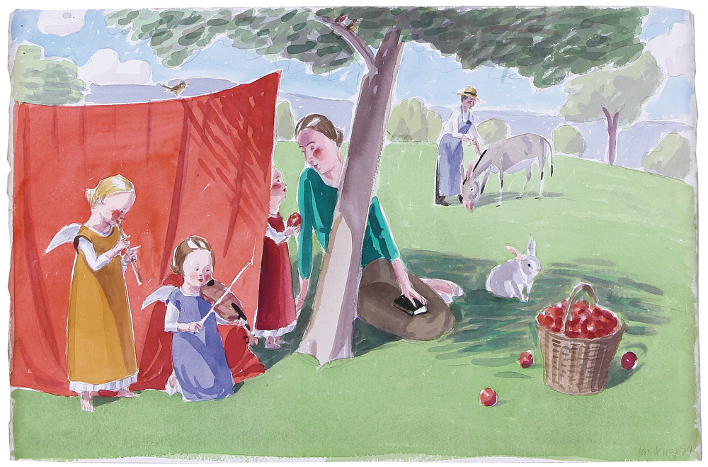 JAN KNAP Chrudimi (Cecoslovacchia) 1949 La tenda rossa con gli angeli, 1999 acquerello su carta cm. 38x57, firma e anno in basso a destra, pubblicato su "Jan Knap, Melodia Ordinata" di Gian Ruggero Manzoni, Santa Giustina Edizioni d'Arte (LU), tavola XXIII.