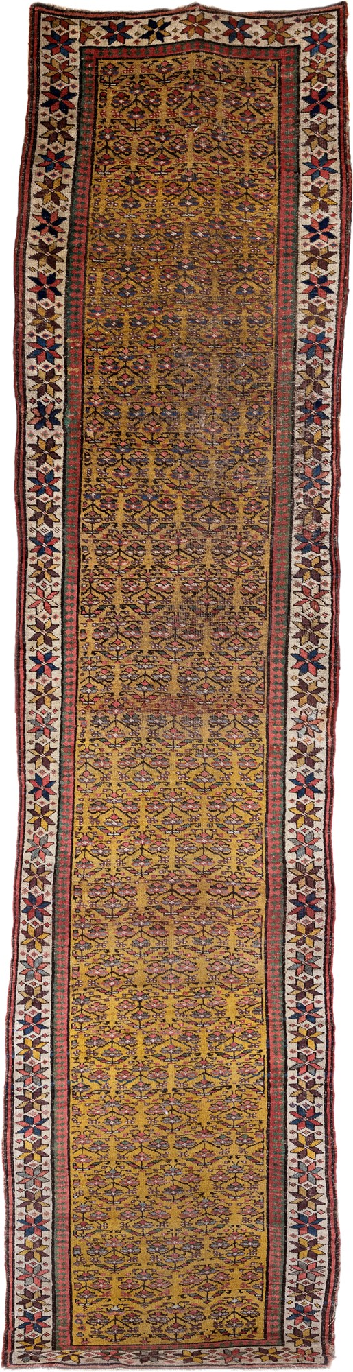 Guida fondo giallo, Caucaso, inizi XX secolo con fitto disegno entro cornice bianca con stelle. Sporco, cm 96x420