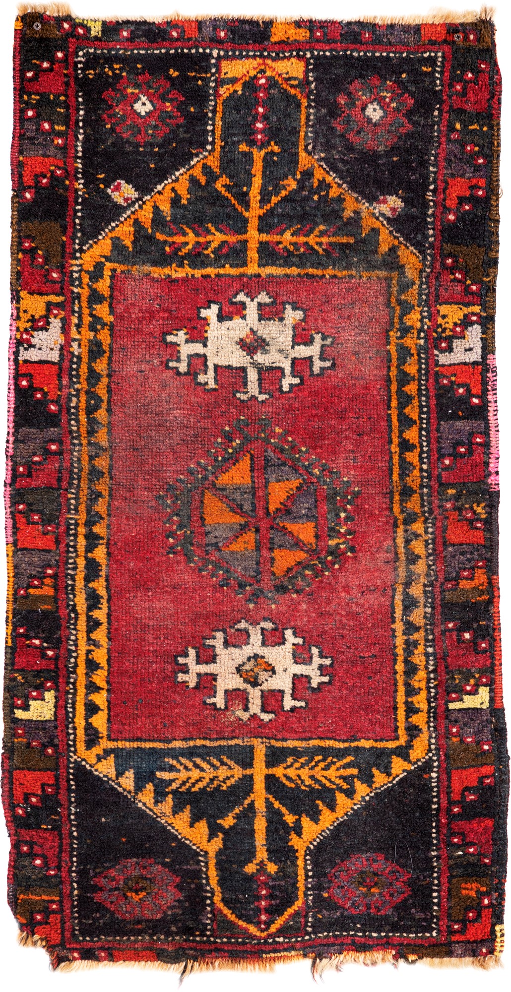 Piccola preghiera a doppia nicchia, Anatolia fondo rosso su campo nero, delimitata da cornice arancio e centrata da tre medaglioni; cornice rossa a motivi geometrici. Difetti e mancanze, cm 95x50
