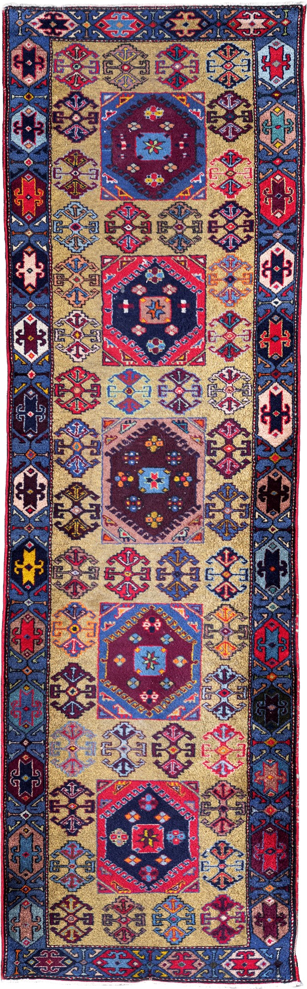 Corsia persiano Ardebil fondo senape con disegno geometrico in toni vivaci, caratterizzata da cinque medaglioni geometrici inscritti circondati da motivi stilizzati sparsi; ampia cornice blu percorsa da motivi geometrici , cm 250x75