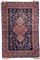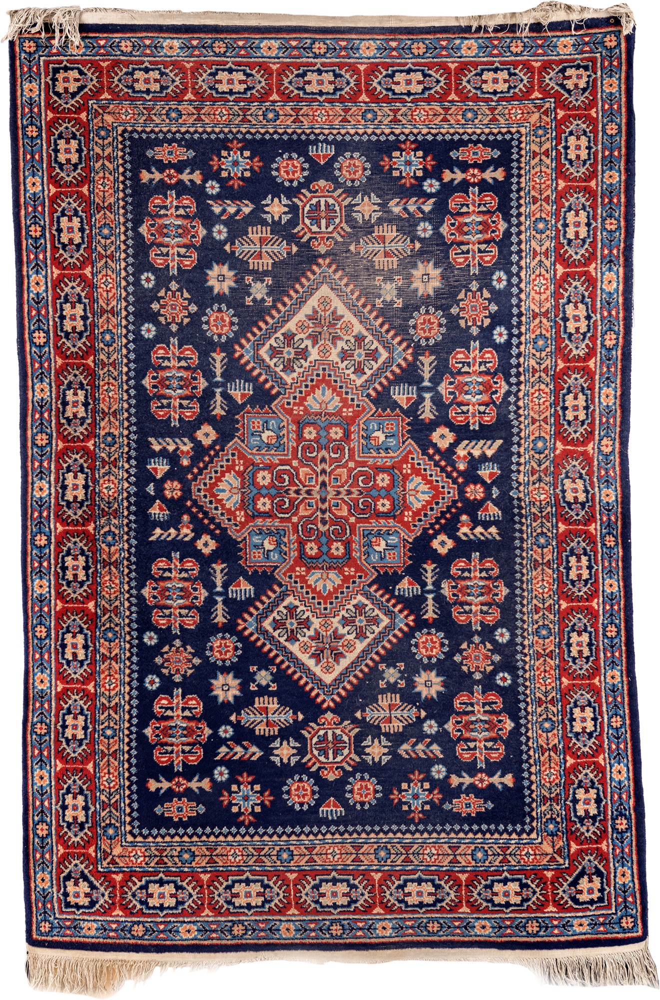 Tappeto persiano Ardebil fondo blu con medaglione centrale cuspidato circondato da motivi stilizzati sparsi nei toni del rosso, celeste e beige; cornice principale fondo rosso. Consunto, cm 178x120