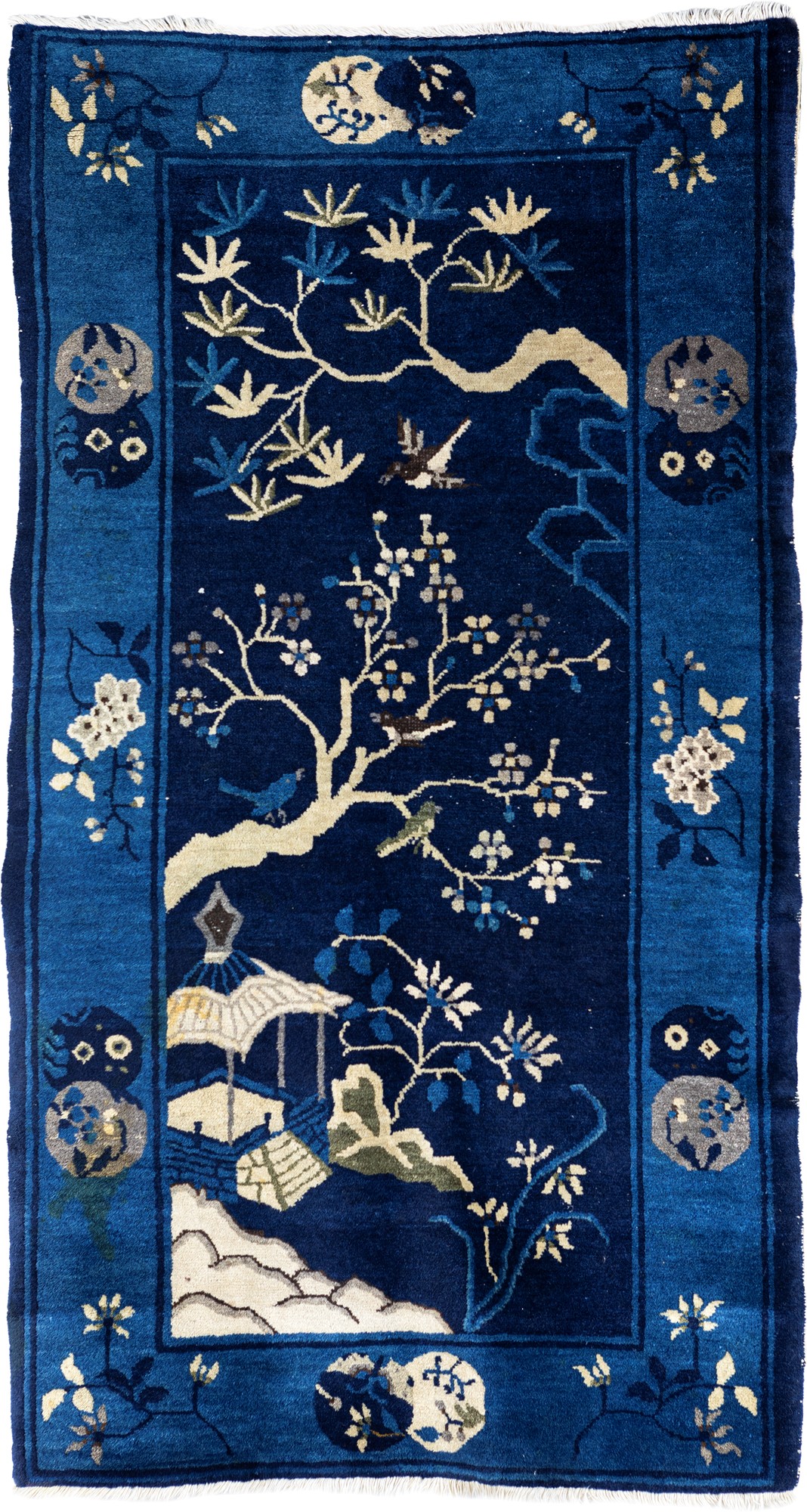 Tappeto Pechino fondo blu, inizi del XX secolo caratterizzato da paesaggio verticale con alberi e case; cornice azzurra a motivi orientali sparsi, cm 169x95