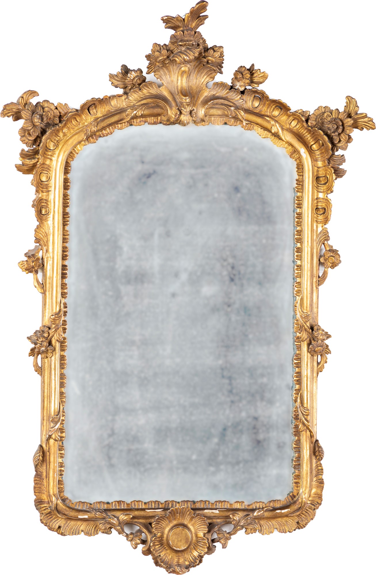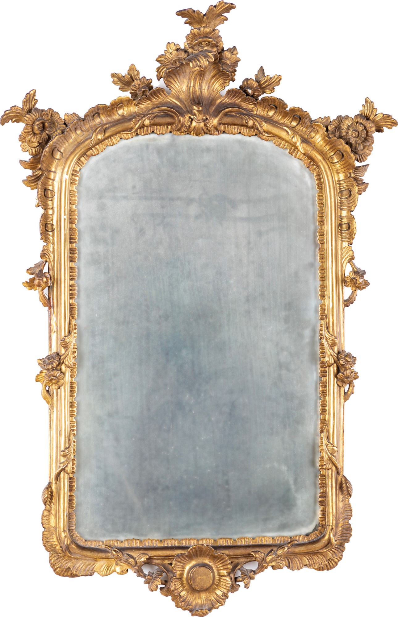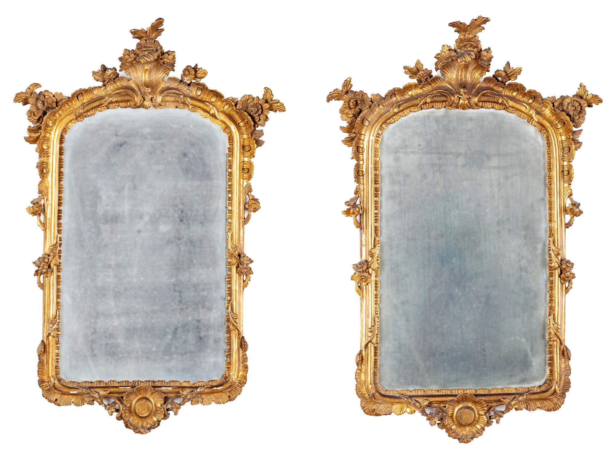 Coppia di specchiere in legno intagliato e dorato a mecca, Napoli, XVIII secolo con cornici intagliate a cartouches, impreziosite lungo il perimetro da rilievi vegetali e composizioni di fiori, cm 97x64