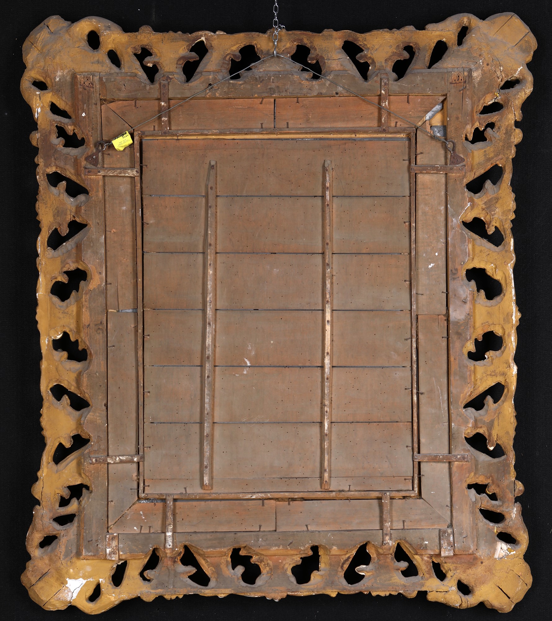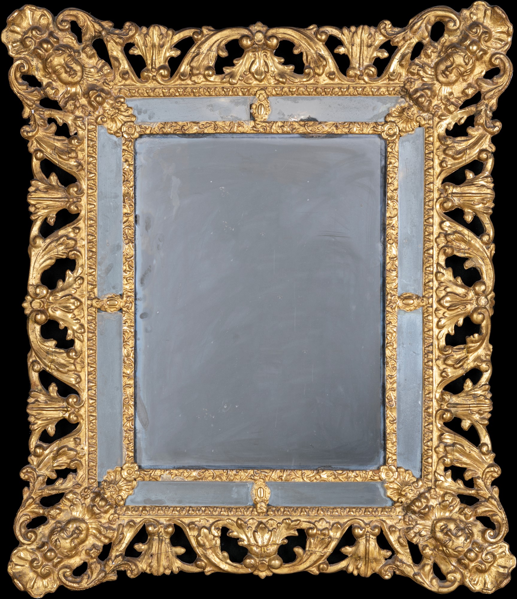Specchiera in legno intagliato e dorato, Italia centrale, XVIII secolo con cornice rettangolare costituita da volute e motivi vegetali traforati, caratterizzata da mascheroni angolari; specchio di epoca posteriore, cm 134x115