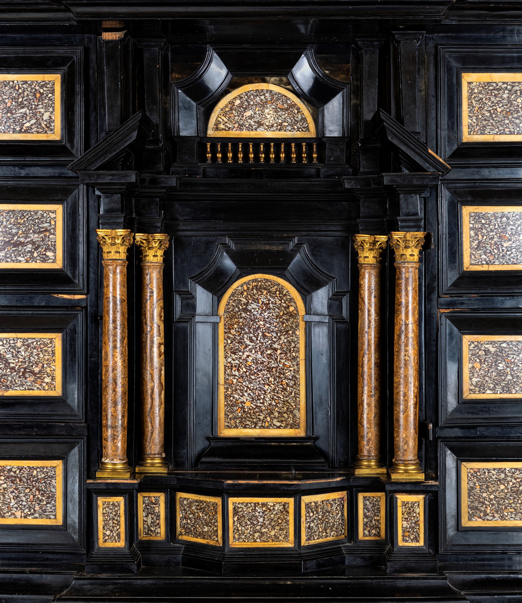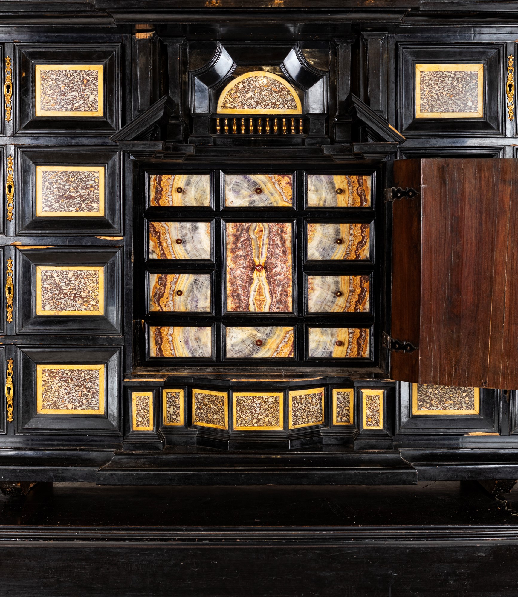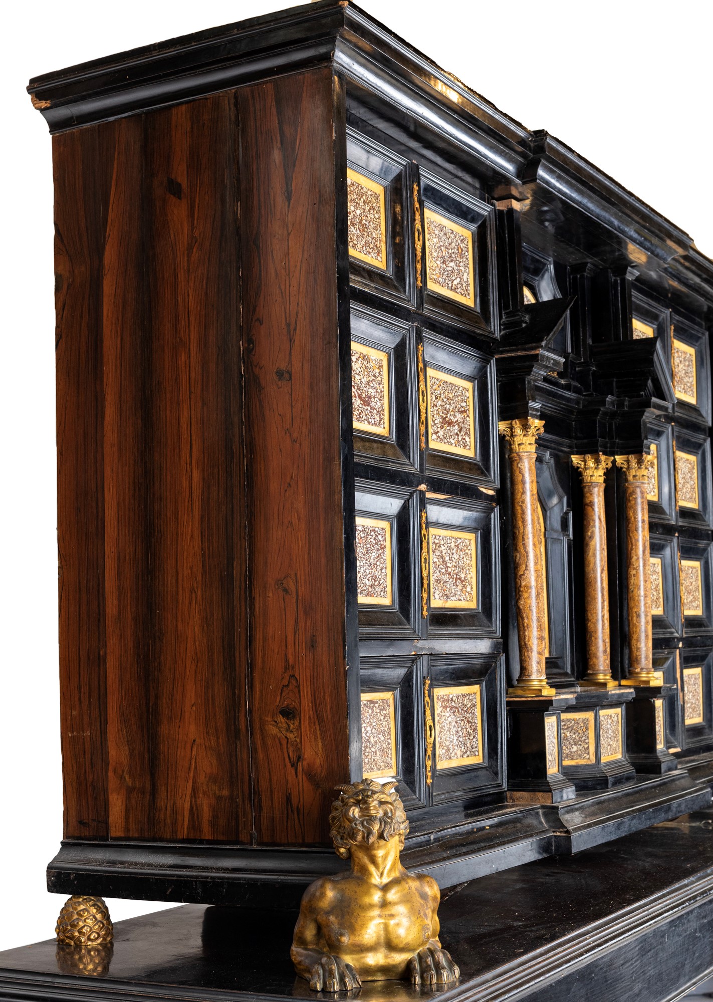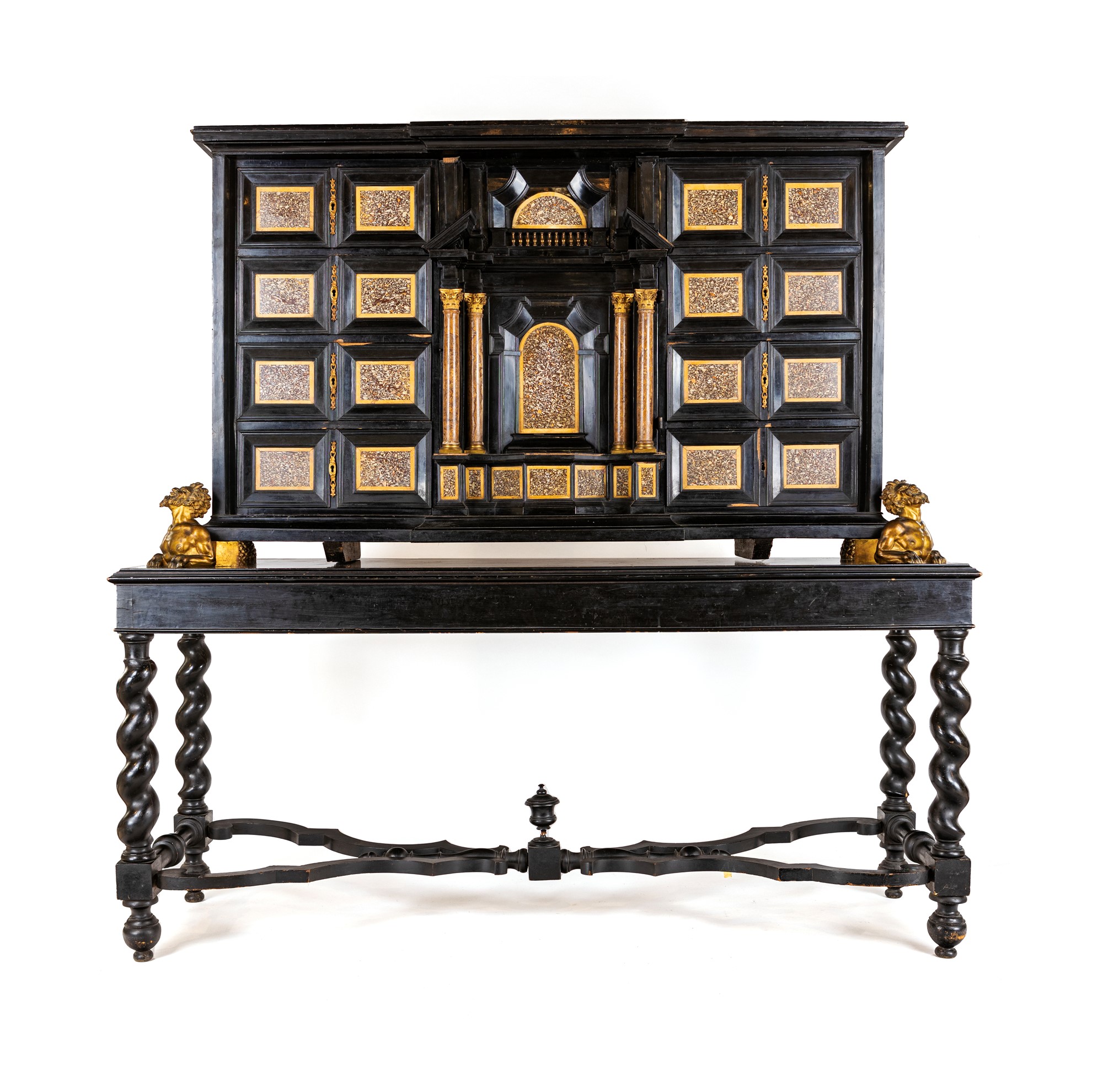 Grande stipo monetiere in legno di noce ebanizzato, Italia centrale, XVII secolo con parte centrale di impostazione architettonica con timpano e basamento comprendenti cassetti; l'anta centrale, in forma di nicchia delimitata da colonne in marmo con capitelli corinzi in bronzo dorato, cela sette cassetti di diversa misura con specchiature in agata racchiuse da cornici modanate con pomelli a sfera in corniola; ai lati dell'edicola si dispongono quattro cassetti in colonna con formelle in marmo semesanto profilato di giallo antico; piedi scultorei in bronzo a forma di sfinge con volto e busto di fauno e braccia con terminali ferini, cui corrispondono sostegni posteriori in forma di pigna. Serrature antiche, una mancante. Base da centro di epoca posteriore in legno ebanizzato con ciglio gradinato, sorretta da quattro gambe tortili riunite da traverse sagomate, piedi a bulbo, cm 104,5x190x58 - la base cm 92x200x62