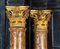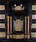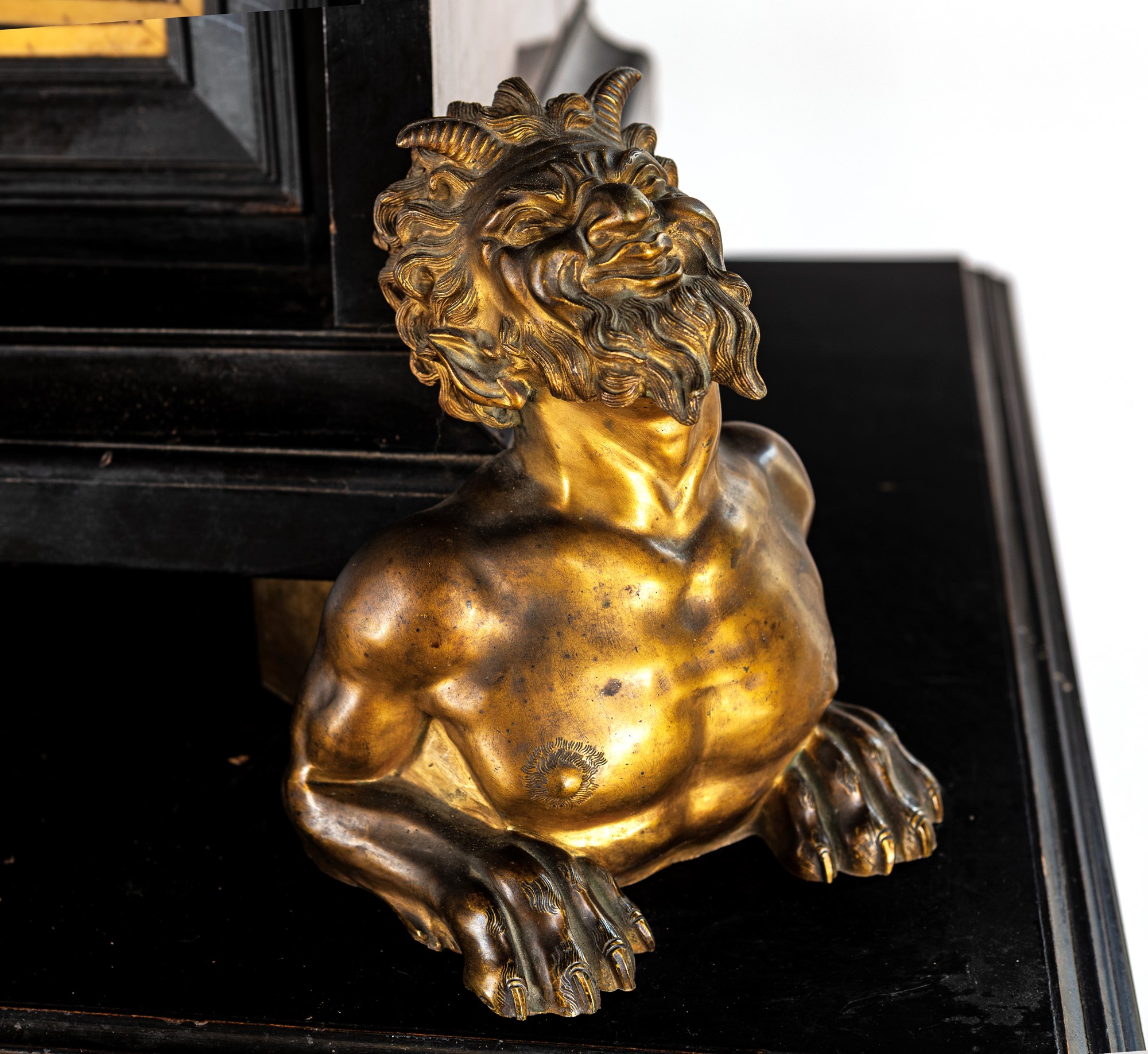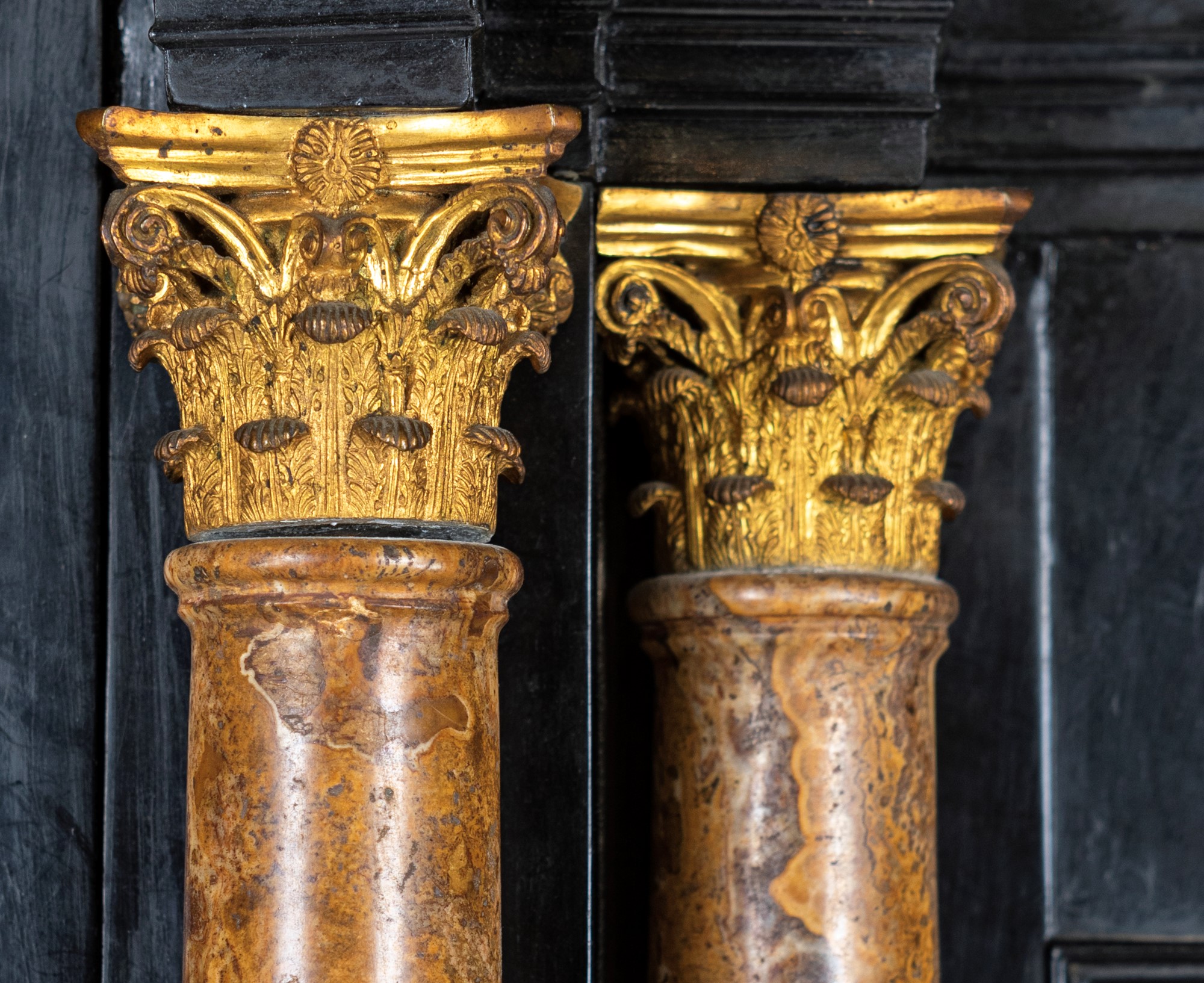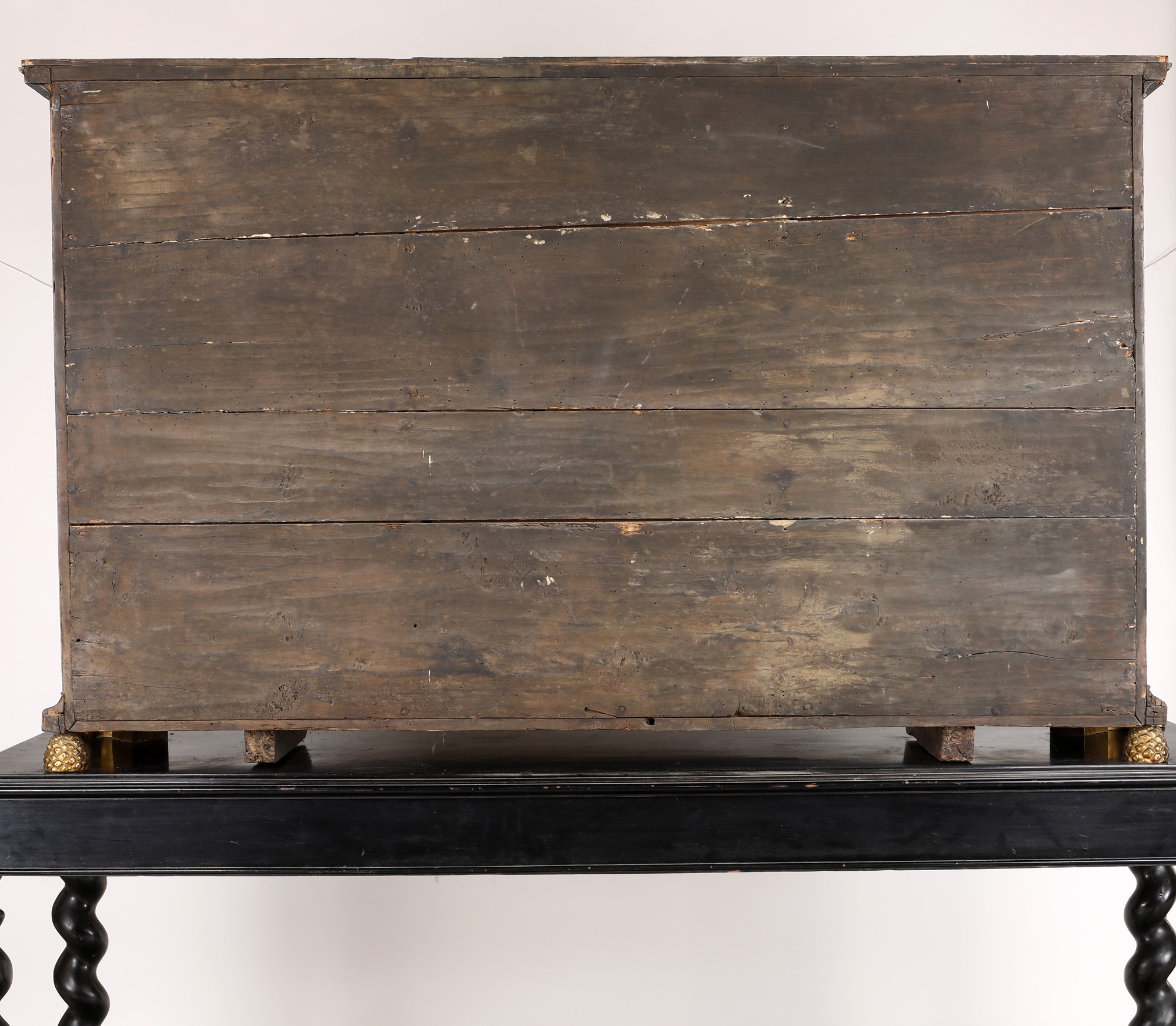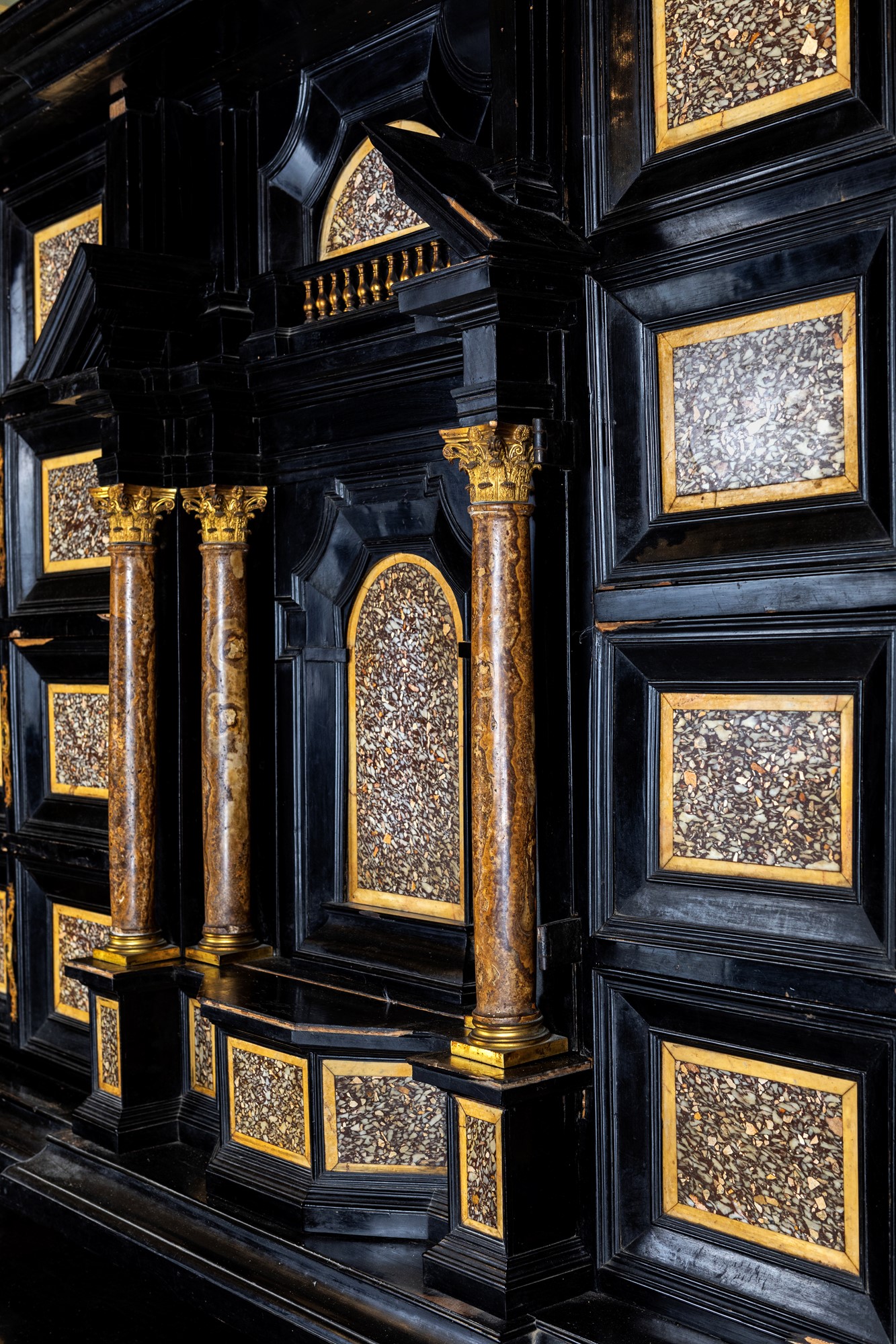 Grande stipo monetiere in legno di noce ebanizzato, Italia centrale, XVII secolo con parte centrale di impostazione architettonica con timpano e basamento comprendenti cassetti; l'anta centrale, in forma di nicchia delimitata da colonne in marmo con capitelli corinzi in bronzo dorato, cela sette cassetti di diversa misura con specchiature in agata racchiuse da cornici modanate con pomelli a sfera in corniola; ai lati dell'edicola si dispongono quattro cassetti in colonna con formelle in marmo semesanto profilato di giallo antico; piedi scultorei in bronzo a forma di sfinge con volto e busto di fauno e braccia con terminali ferini, cui corrispondono sostegni posteriori in forma di pigna. Serrature antiche, una mancante. Base da centro di epoca posteriore in legno ebanizzato con ciglio gradinato, sorretta da quattro gambe tortili riunite da traverse sagomate, piedi a bulbo, cm 104,5x190x58 - la base cm 92x200x62