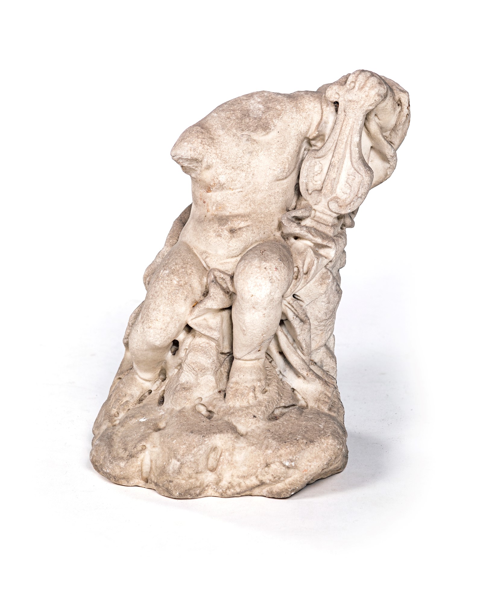 Scultura acefala in pietra, XVII secolo raffigurante Orfeo ritratto seduto con la cetra
