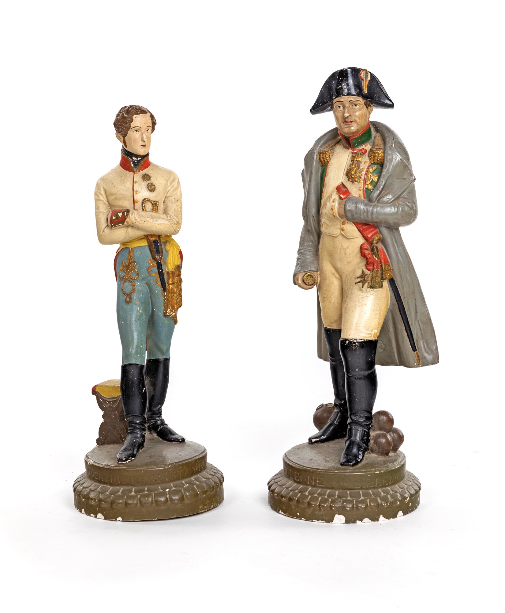 Napoleone Bonaparte e suo figlio Napoleone Francesco Giuseppe Carlo, metà del XIX secolo, due sculture in gesso policromo, L'Imperatore è ritratto col bicorno nero in testa, redingote grigia e l'uniforme da Colonnello dei Granatieri a piedi della Guardia Imperiale con le insegne della Legion d'Onore e della Corona di Ferro; palle di cannone ai suoi piedi, un cannocchiale nella mano destra e la mano sinistra infilata nel gilet; iscritto lungo il profilo della base "Napoleone in S. Elena". Il giovane Napoleone II indossa l'uniforme militare austriaca; sul piedistallo "Duca di Regi.stati" (Duca di Reichstadt), titolo che gli fu insignito nel 1818 alla corte imperiale austriaca, altezza cm 60 e cm 64 rispettivamente