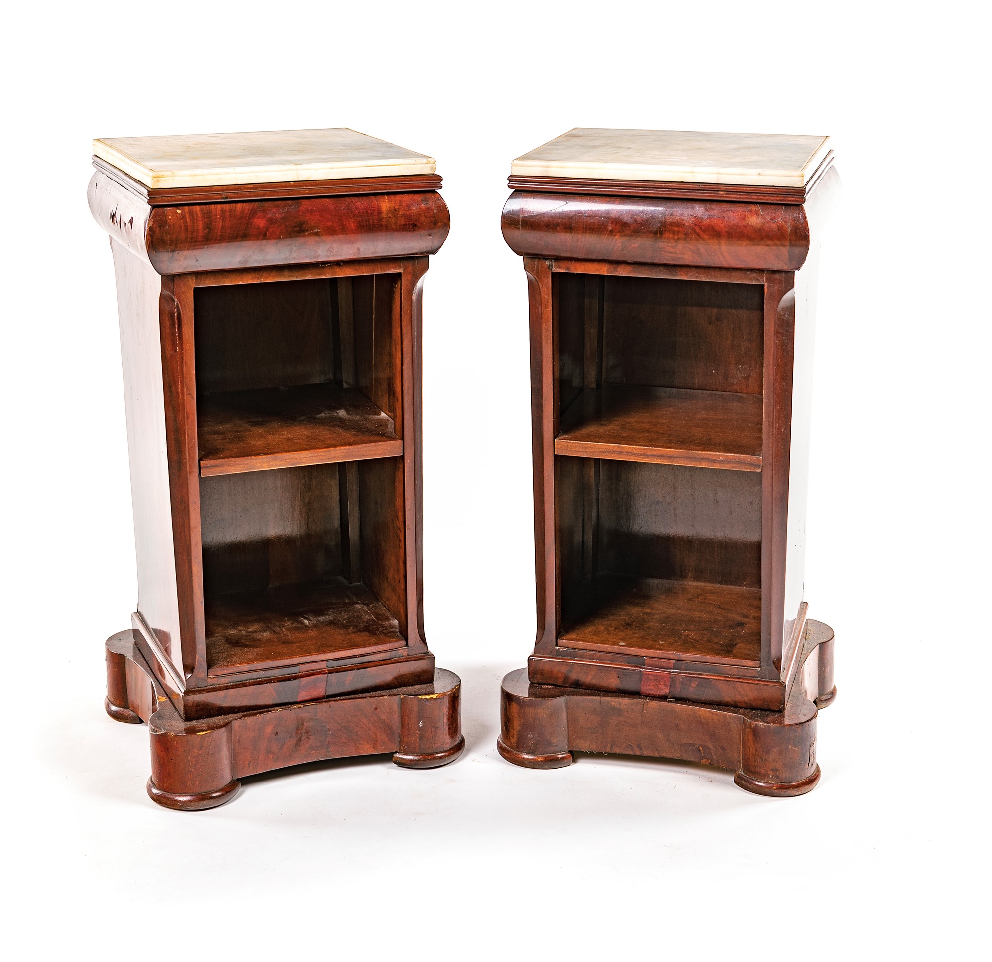 Coppia di comodini da centro in mogano, Italia, XIX secolo piano quadrangolare in marmo bianco, fascia convessa comprendente un cassetto, facciata a giorno suddivisa da un piano, base con angoli prominenti arrotondati, cm 76x40x38 - il piano cm 34x34