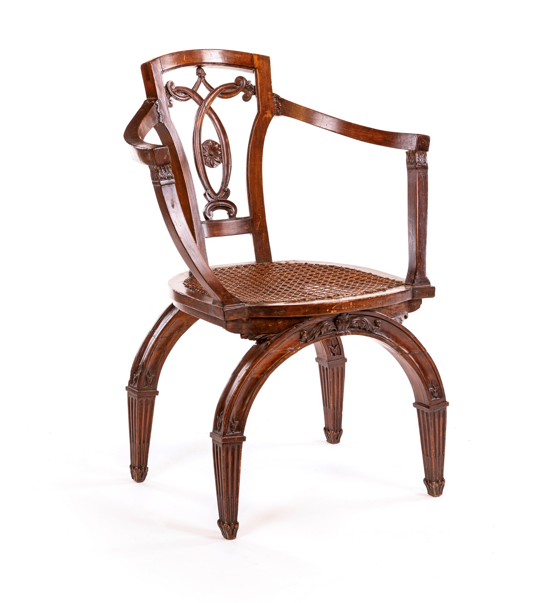 Poltroncina in legno patinato, XIX secolo con schienale a giorno caratterizzato da cornici incrociate a formare una cartella a mandorla centrata da corolla intagliata, sedile in paglia di Vienna sormontato da cuscino in raso giallo, braccioli e sostegni lineari, sostegni ad arco, cm 82x60x46