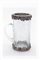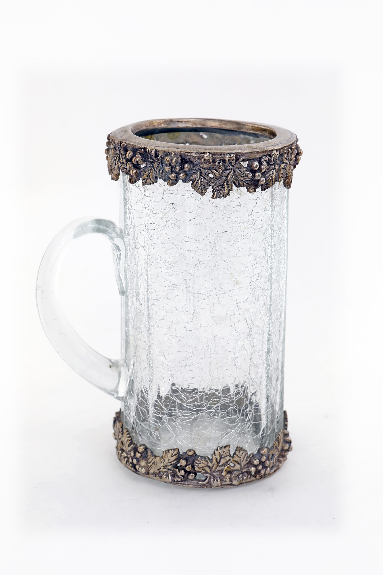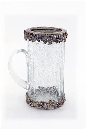 Boccale in vetro craquelé con profilo in metallo argentato corpo cilindrico sfaccettato con manico arcuato e profili guarniti da foglie di vite con grappoli in rilievo, altezza cm 20