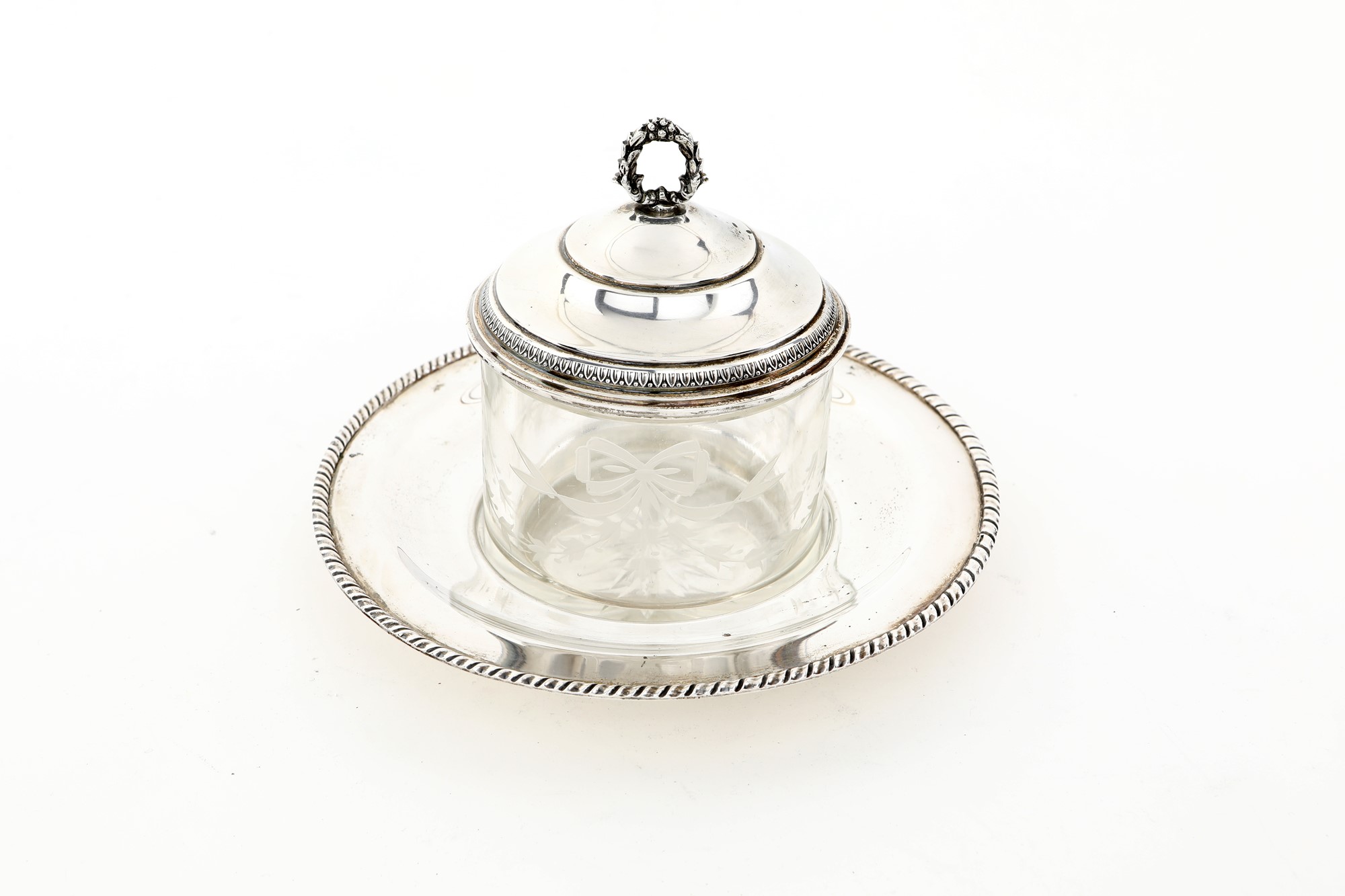 Formaggera in vetro e argento con coperchio contenitore cilindrico decorato da festoni molati sorrette da fiocchi, coperchio a cupolino con profilo a palmette e presa in forma di ghirlanda, piatto con profilo cordonato, cm 11x9 - diametro del piatto cm 16 - gr. 178