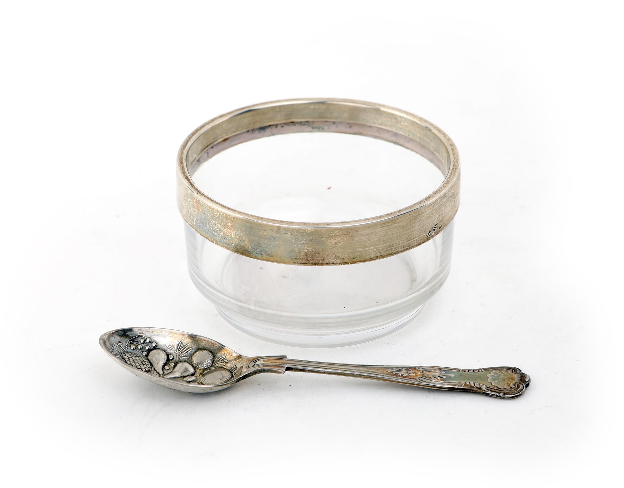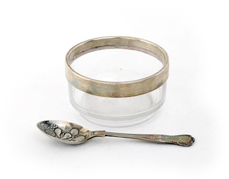 Coppetta in vetro con profilo in argento sterling con cucchiaio da cerimonia in metallo argentato con frutti sbalzati , cm 6x10,8 - cucchiaio cm 15,5
