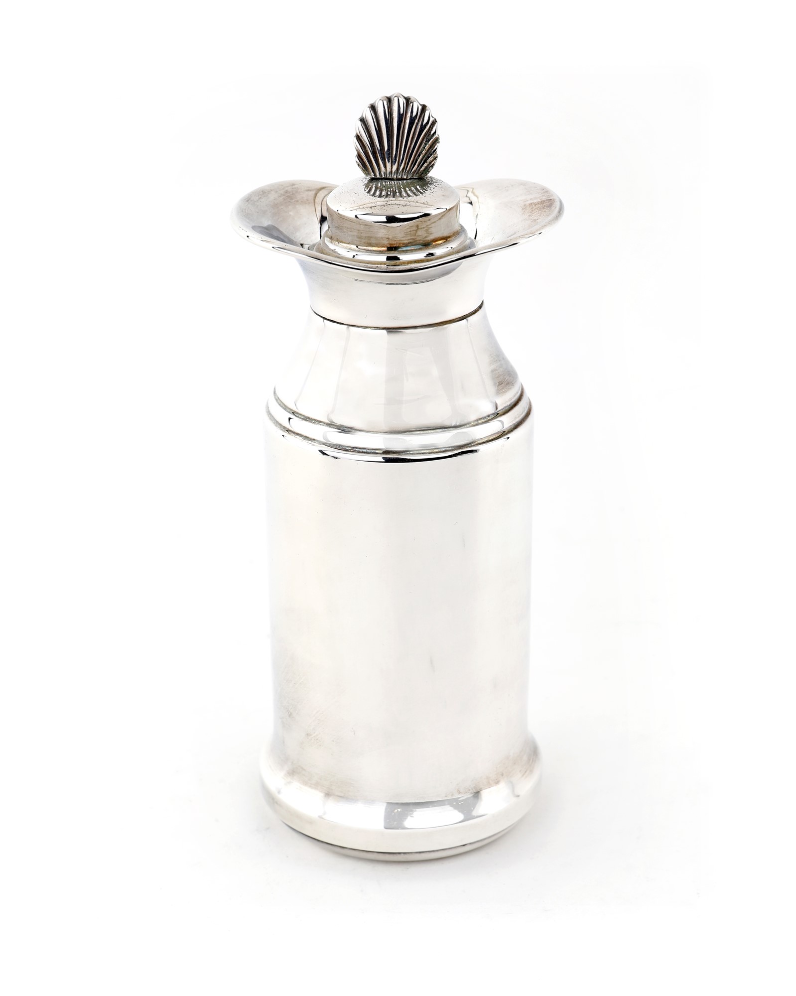 Thermos in argento con tappo sormontato da conchiglia, altezza cm 18